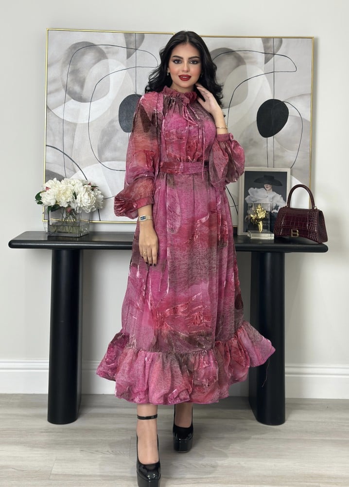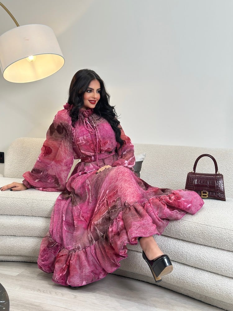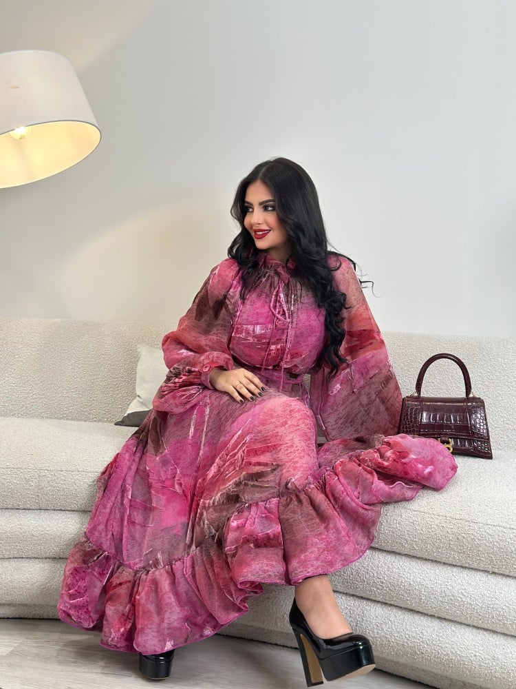 فستان ميدي انثوي و ملفت بقماش شيفون كوري بلمسة فنية من نقشات مخملية بسيطة تضيف للقطعة جمال مع انعكاس الضوء.
